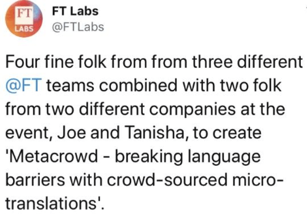 Tanisha collaborated with individuals from Financial Times and BBC News Labs to create a multilingual newsroom tool, ‘MetaCrowd – Breaking language barriers with crowd-sourced micro translations’.